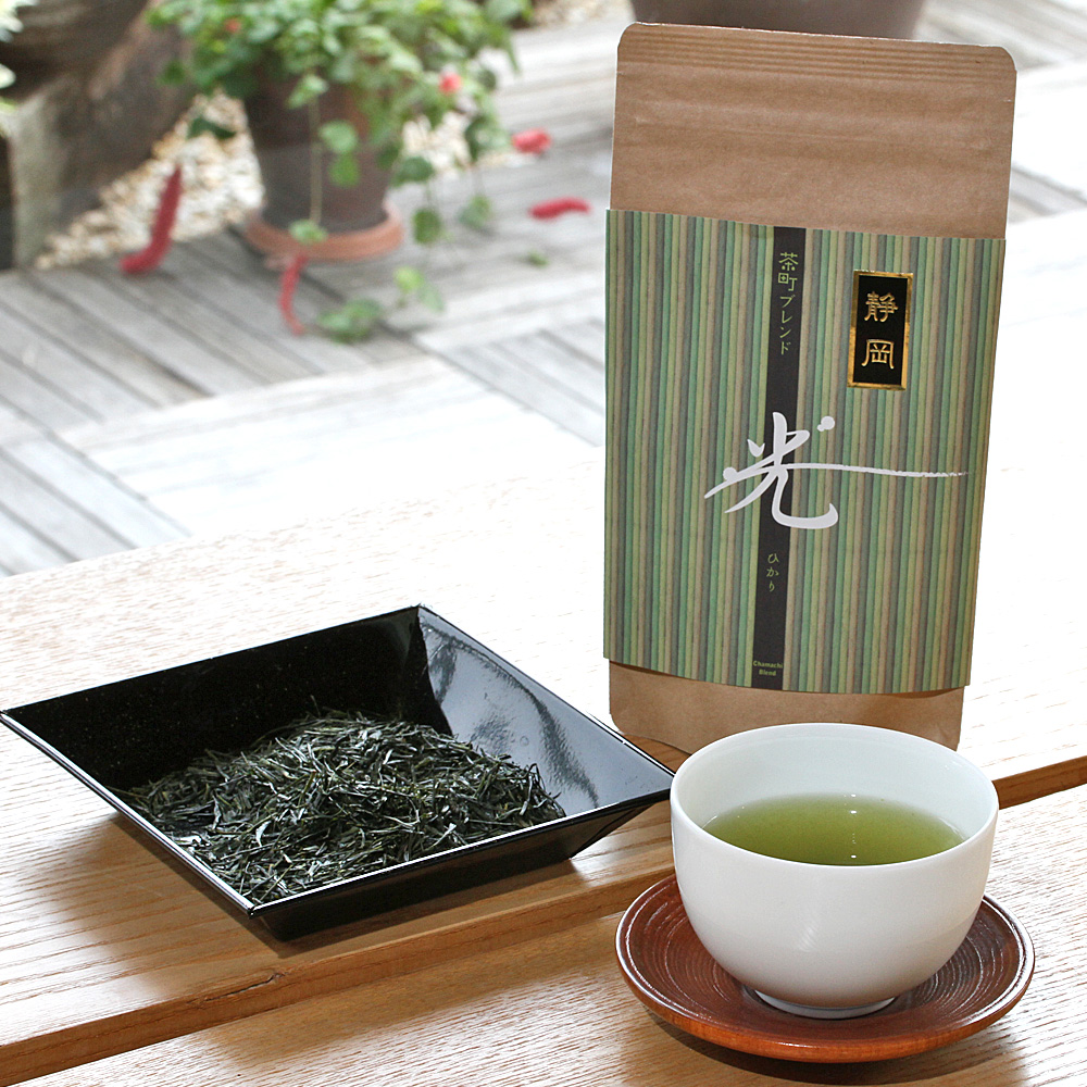 茶町ブレンドは、店主の前田冨佐男が愛情と情熱を込めて選び抜いた煎茶のシリーズです。その中で、「光」は鮮やかな水色で、さらっとした味わいで何杯でもいただける安心感のお得なお茶です。一日の始まりに、終わりにお気軽にお楽しみくださいませ。
